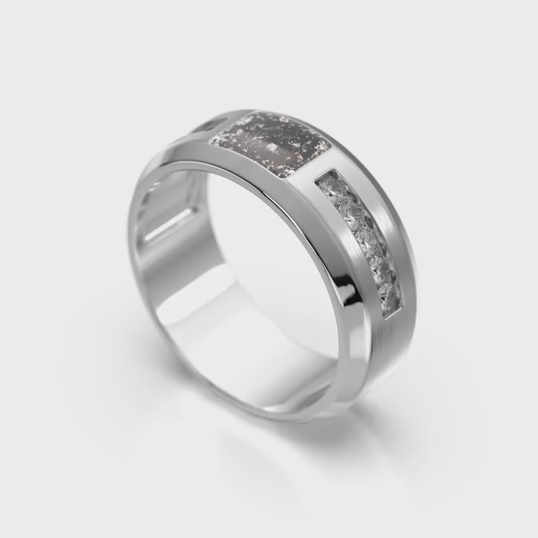 Introducing the Aura-Star Unisex Great ring, a stunning and timeless piece of memorial jewellery for him (or her). This elegant ring is expertly crafted from high-quality sterling silver and features a square centerpiece that is infused with the ashes of your loved one.